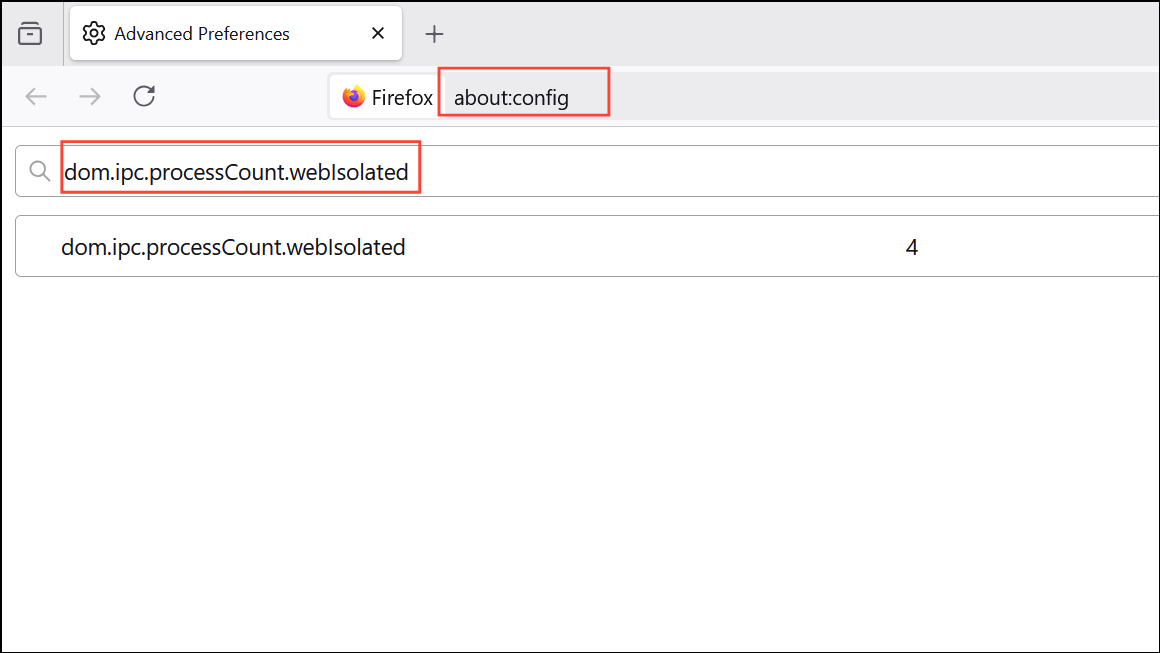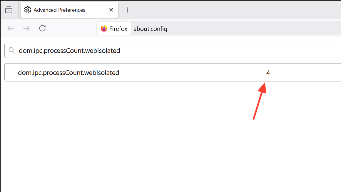 Step 1: Enter about:config in the address bar and search for dom.ipc.processCount.webIsolated.