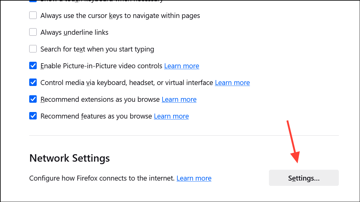 Step 2: Scroll down to the Network Settings section at the bottom of the General panel. Click the Settings… button.