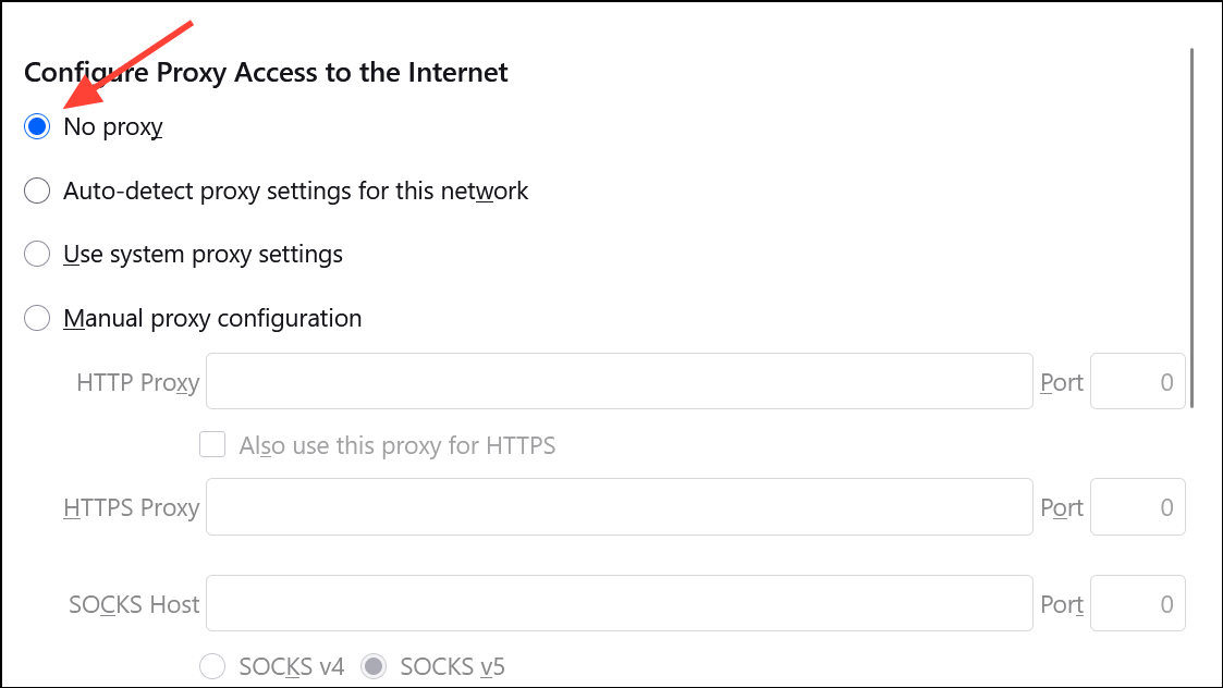 This adjustment bypasses potential misconfigurations in Windows 11 system proxy settings that may block Firefox's internet access, even when no explicit proxy is set. Users report that switching to "No proxy" immediately resolves the infinite update check and restores normal browsing.