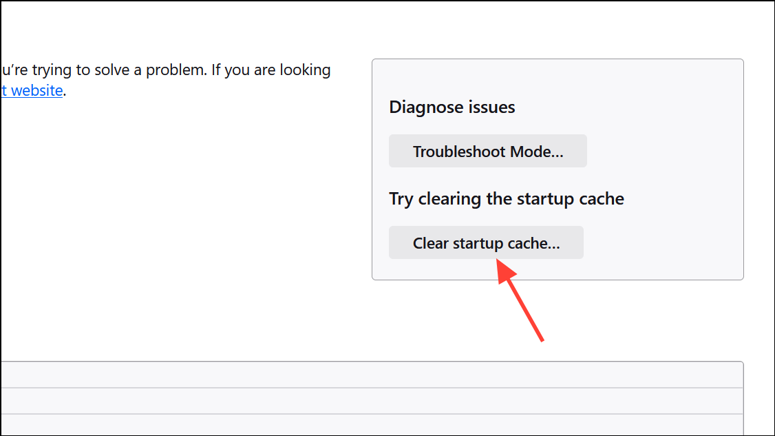 Step 3: To clear the startup cache, go to Help > More Troubleshooting Information, then click Clear startup cache… and confirm the restart. This removes temporary files that may interfere with browser loading and update checks.