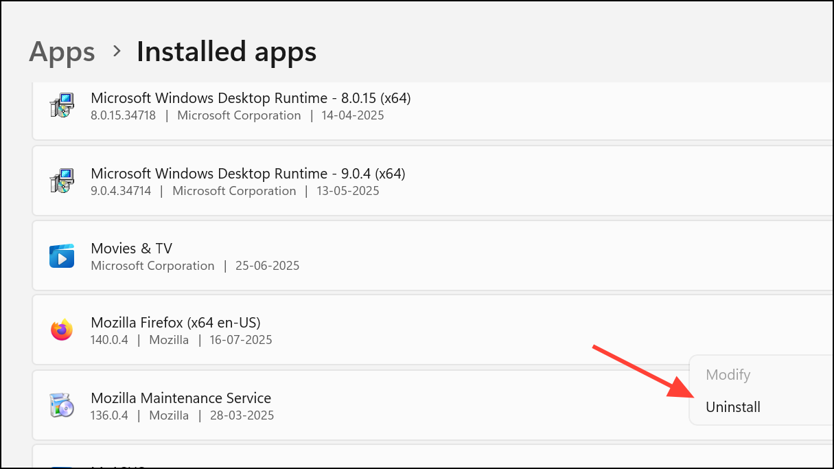 Step 2: Uninstall Firefox from Settings > Apps > Installed apps in Windows 11. Delete any remaining C:\Program Files\Mozilla Firefox folder.