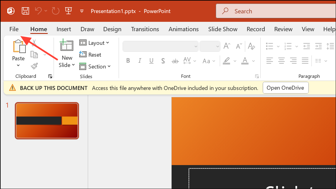 Step 1: Open your presentation and select the File menu. This gives you access to PowerPoint’s settings and export options.