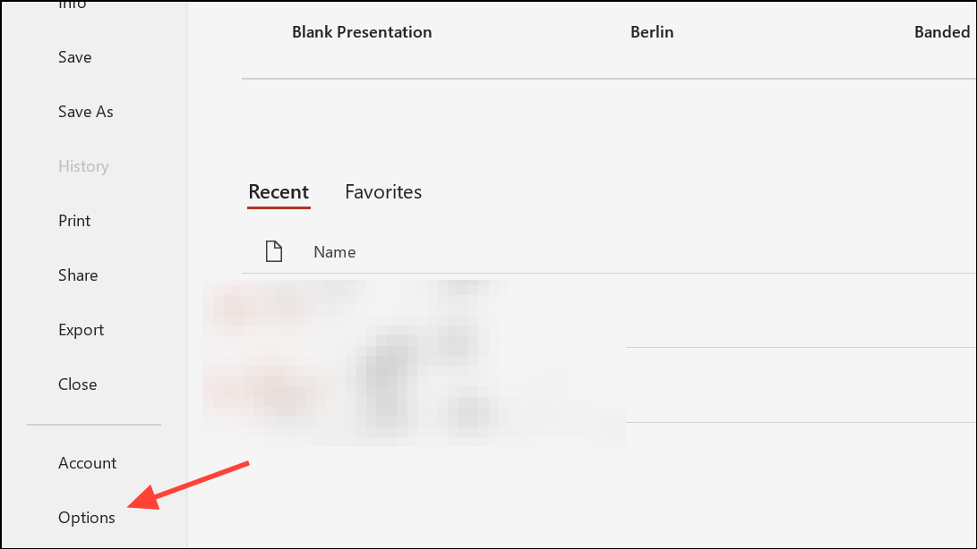 Step 2: Click Options at the bottom of the left-hand pane to open the PowerPoint Options dialog.