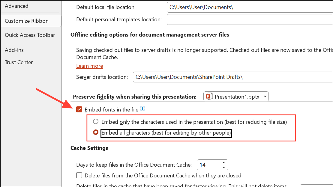 Step 4: Locate the section labeled Preserve fidelity when sharing this presentation and check the box for Embed fonts in the file. Choose Embed only the characters used in the presentation for smaller file size if recipients won’t edit the file, or Embed all characters if others may edit it.