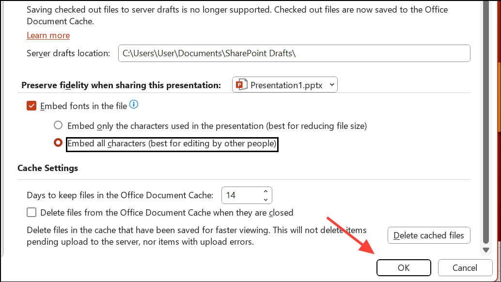 Step 5: Click OK to save your changes. When you send this file, the fonts you used should display correctly on other Windows PCs.