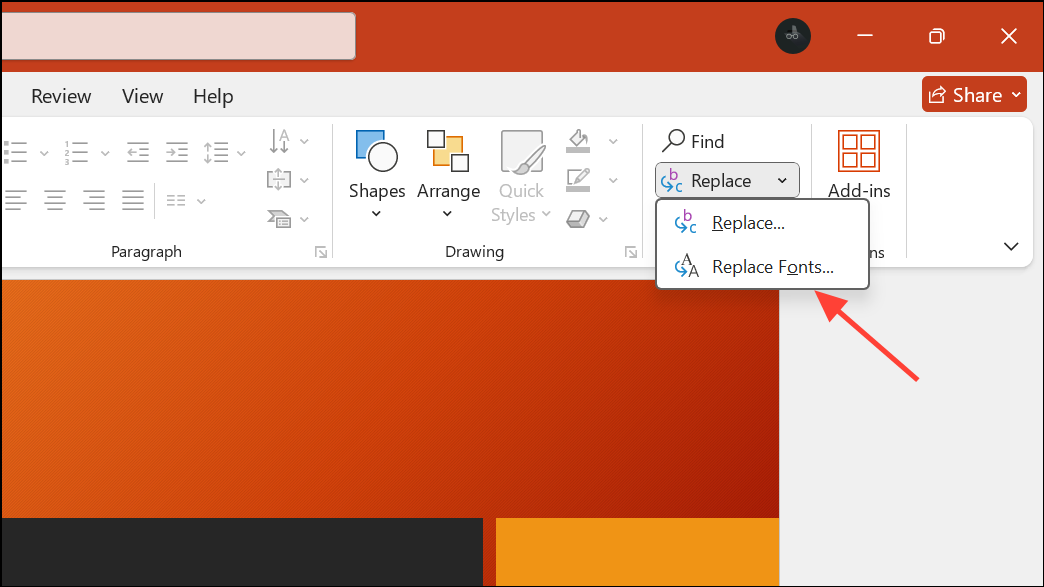 Step 1: Go to the Home tab and select Replace > Replace Fonts.