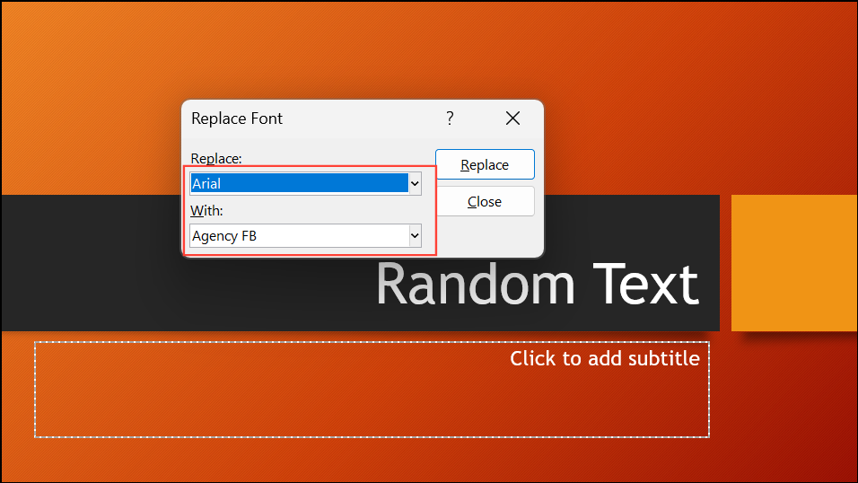 Step 2: In the dialog box, choose the problematic font in the first dropdown and a different font in the second dropdown. Click Replace.