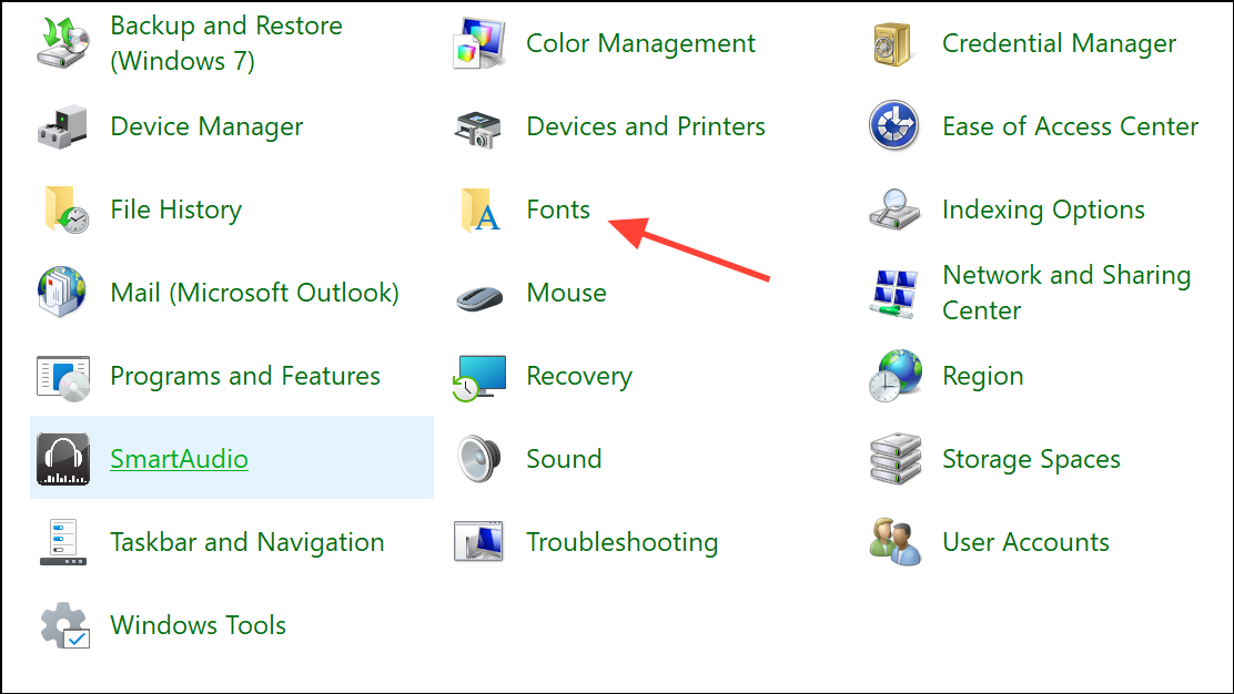Step 1: Open the Control Panel and navigate to Fonts to confirm your font is listed. If not, reinstall it and restart your computer.