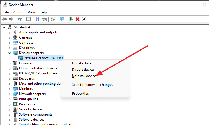 If no updates are found, you can uninstall the driver by right-clicking your graphics card and selecting Uninstall device.