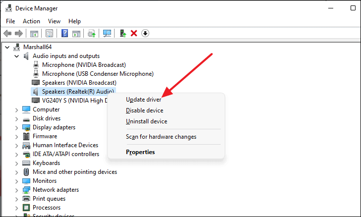 - Right-click your audio device and select Update driver.