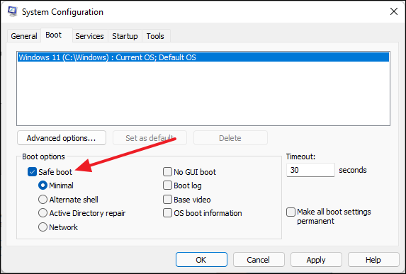 - Check the box for Safe boot and select Minimal.