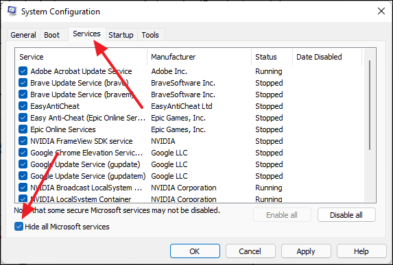- Check Hide all Microsoft services.
