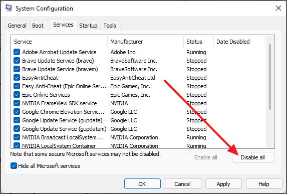 - Click Disable all, then click OK and restart your computer.