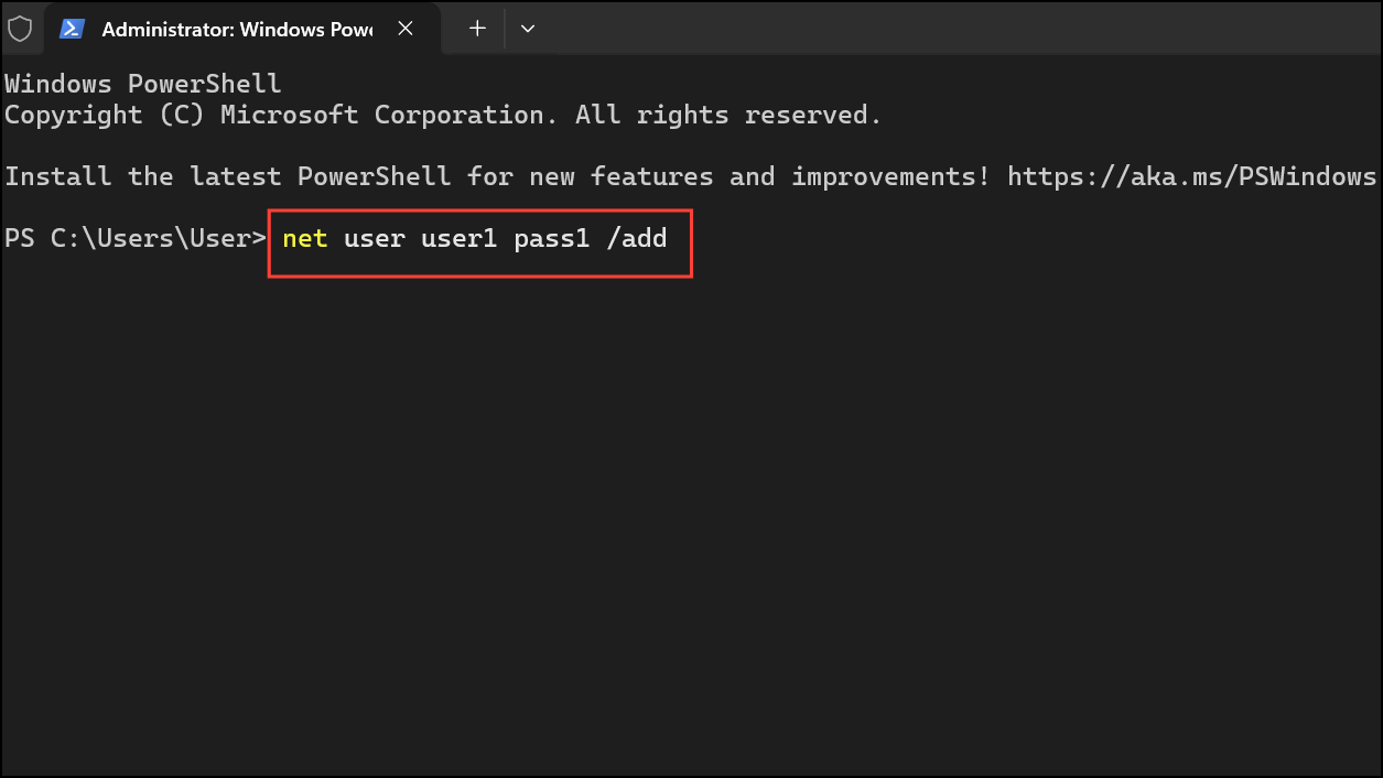 net user user1 pass1 /add