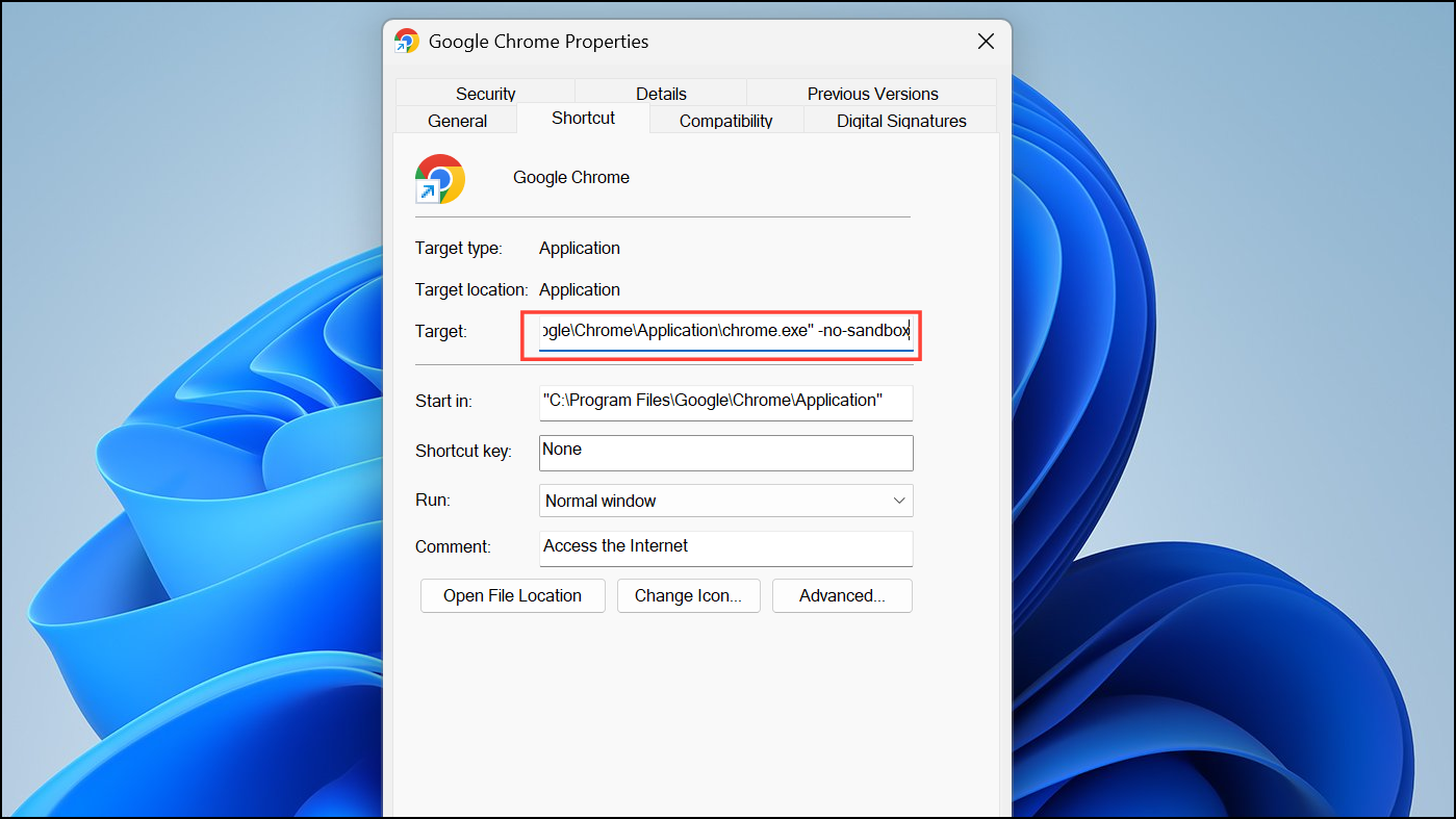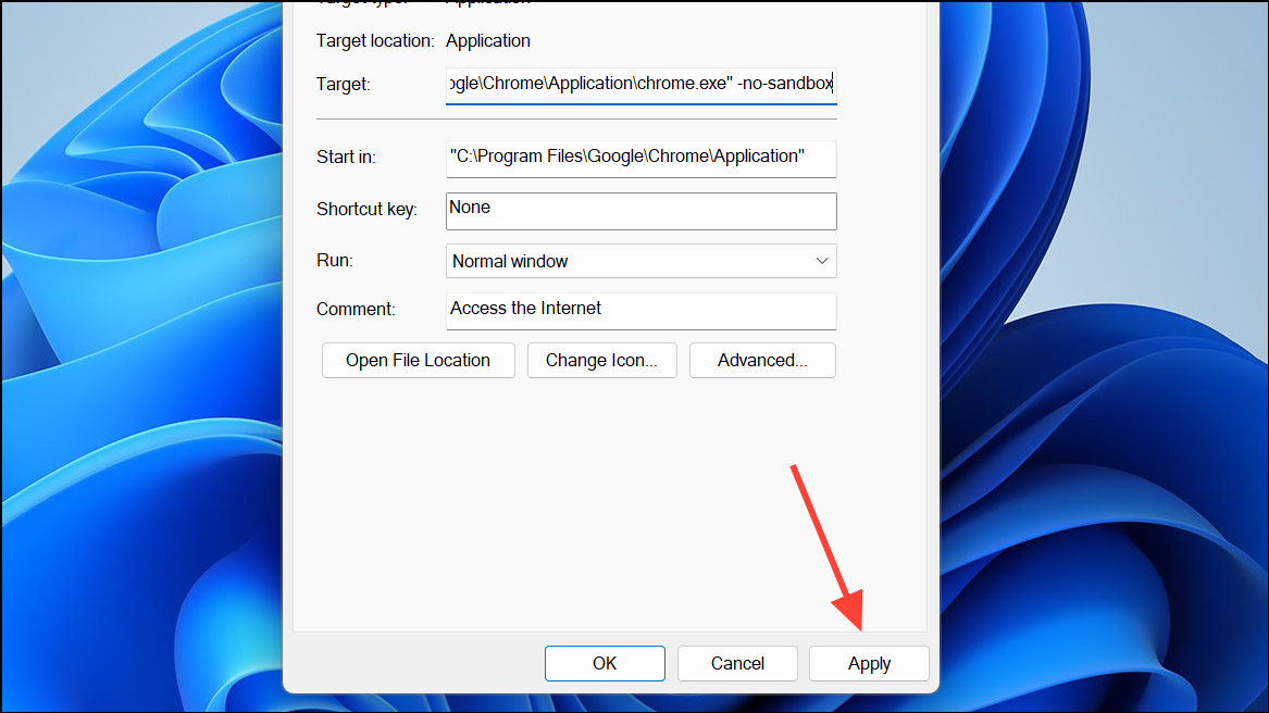 Step 3: Click Apply and OK, then try launching Chrome using this shortcut. The -no-sandbox flag disables a security feature that sometimes conflicts with Windows updates, especially after system changes.