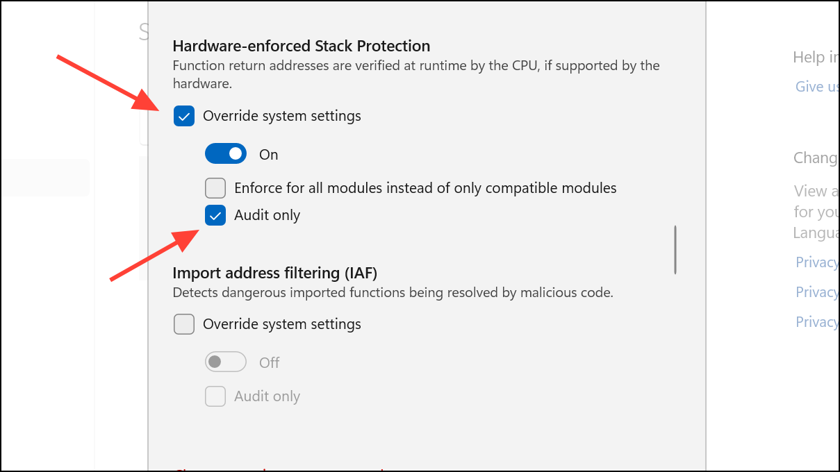 Step 3: Select Edit, find Hardware-enforced stack protection, set it to Override system settings, turn it on, and choose Audit only. This change allows Chrome to run while logging any protection events, helping isolate compatibility problems.