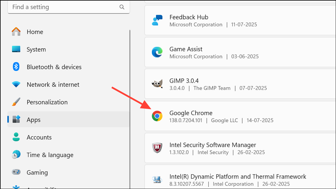 Step 1: Open Settings using Win + I. Go to Apps and find Google Chrome in the list.
