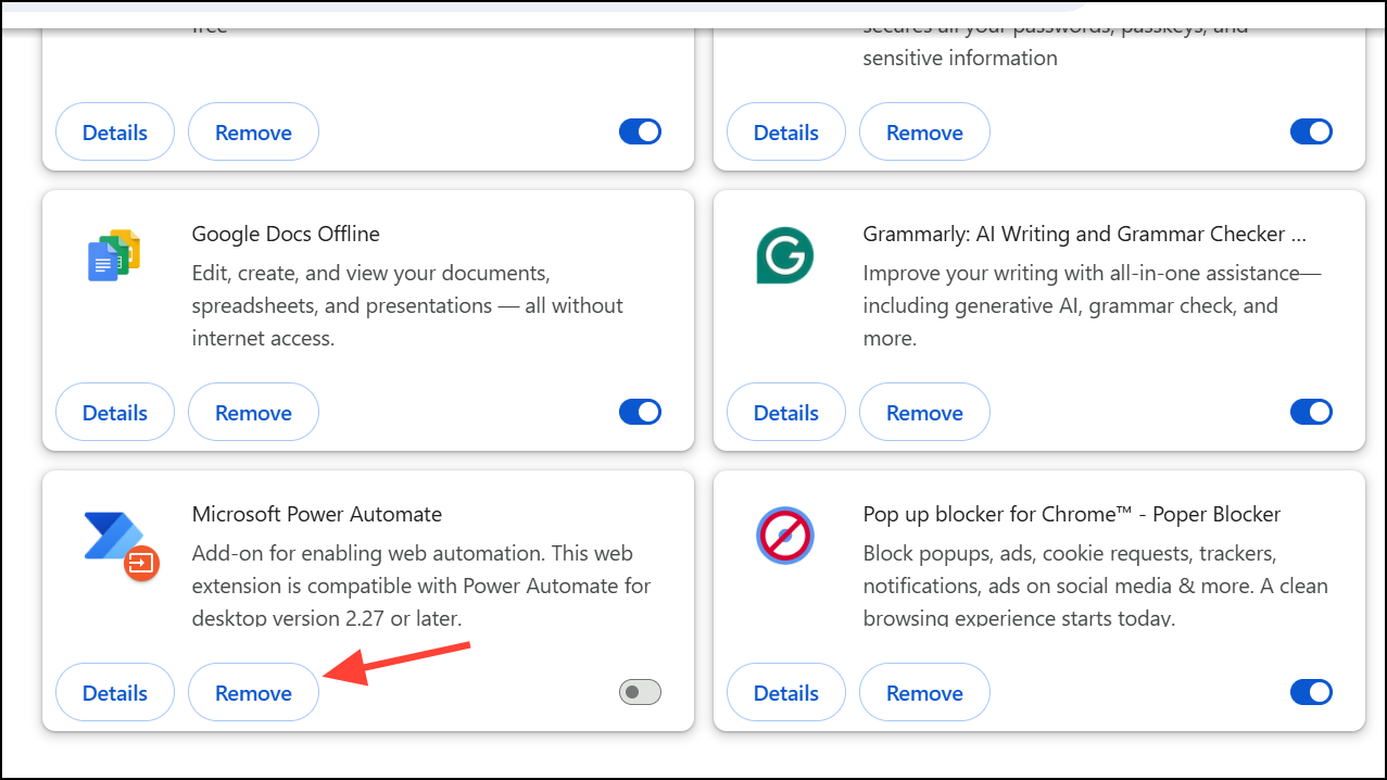 Step 3: Open More tools > Extensions. Toggle off all extensions, then restart Chrome. If Chrome stabilizes, re-enable extensions one by one to find any causing issues.