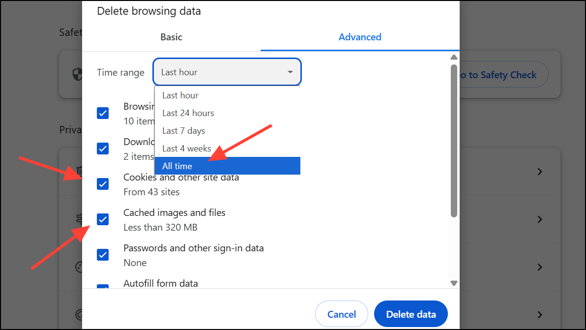 Step 2: In the dialog, select “All time” as the time range. Check the boxes for “Cookies and other site data” and “Cached images and files.”