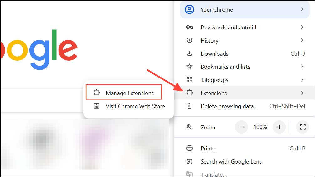Step 1: Click the three-dot menu in the top-right corner of Chrome, select “Extensions,” and go to "Manage Extensions."