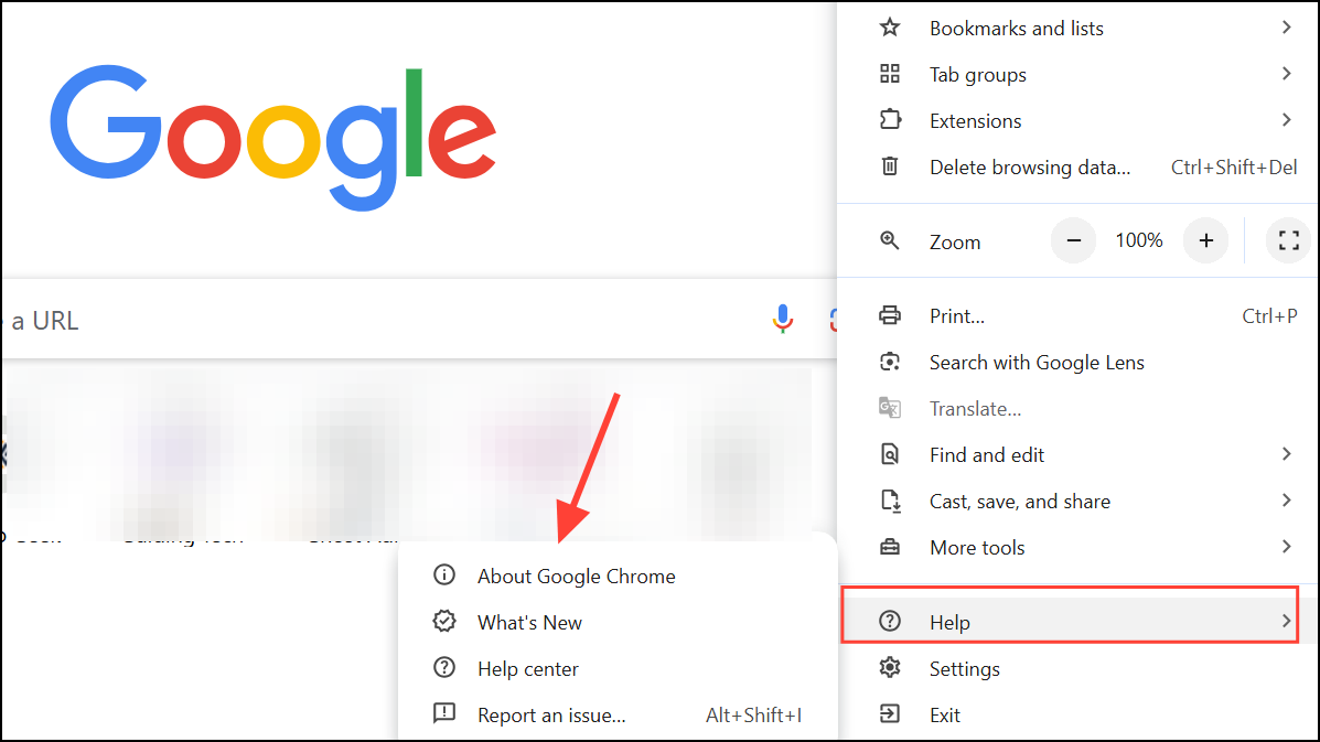 Step 1: Click the three-dot menu, select “Help,” then “About Google Chrome.”