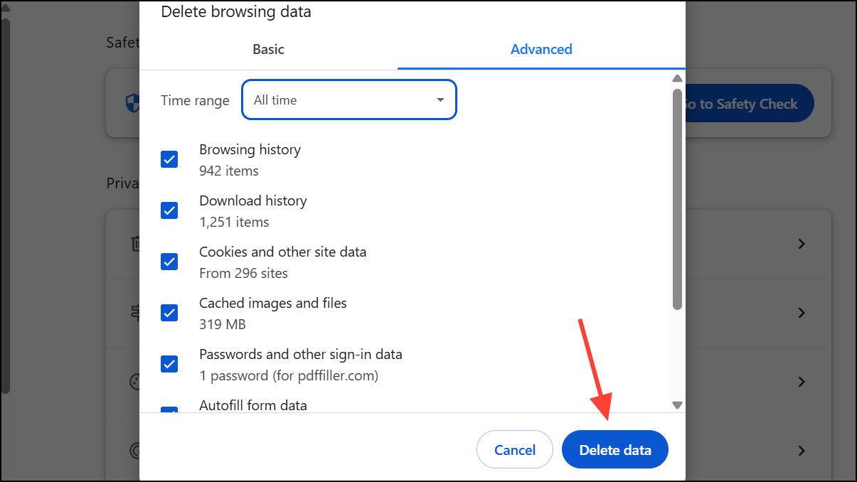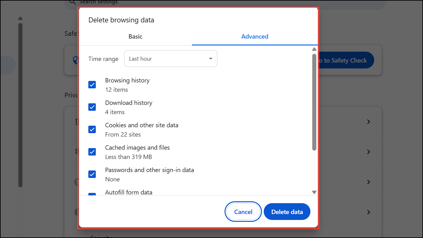 Step 4: Click Delete data. Wait for Chrome to finish deleting the files, then restart the browser. Removing outdated or corrupted cache files forces Chrome to rebuild its cache, often eliminating the waiting error and restoring normal page load speeds.