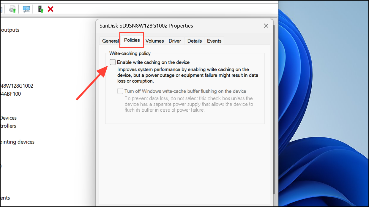 Step 3: Go to the Policies tab. Uncheck Enable write caching on the device and click OK.