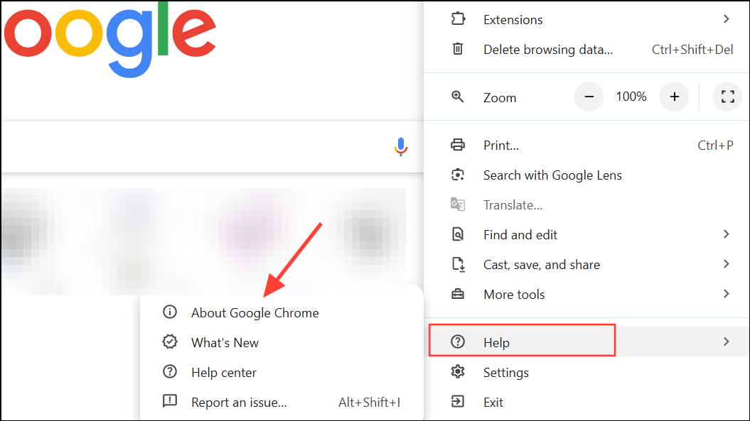 Step 1: Click the three dots menu, go to Help, and select About Google Chrome.