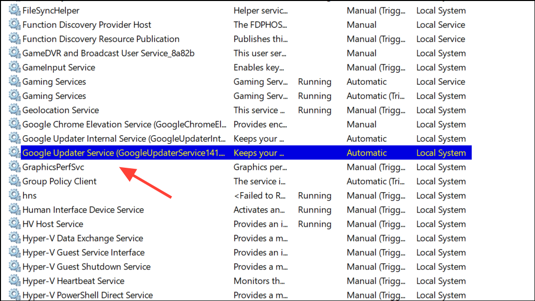 Step 2: Locate the services named Google Update Service (gupdate) and Google Update Service (gupdatem). Double-click each service to open its properties.