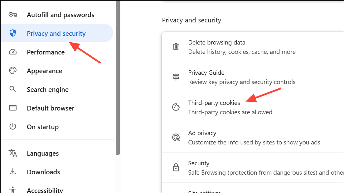 Step 2: Navigate to the privacy or cookies section. In Chrome, go to Privacy and security > Third-party cookies. In Firefox, look under Privacy & Security.