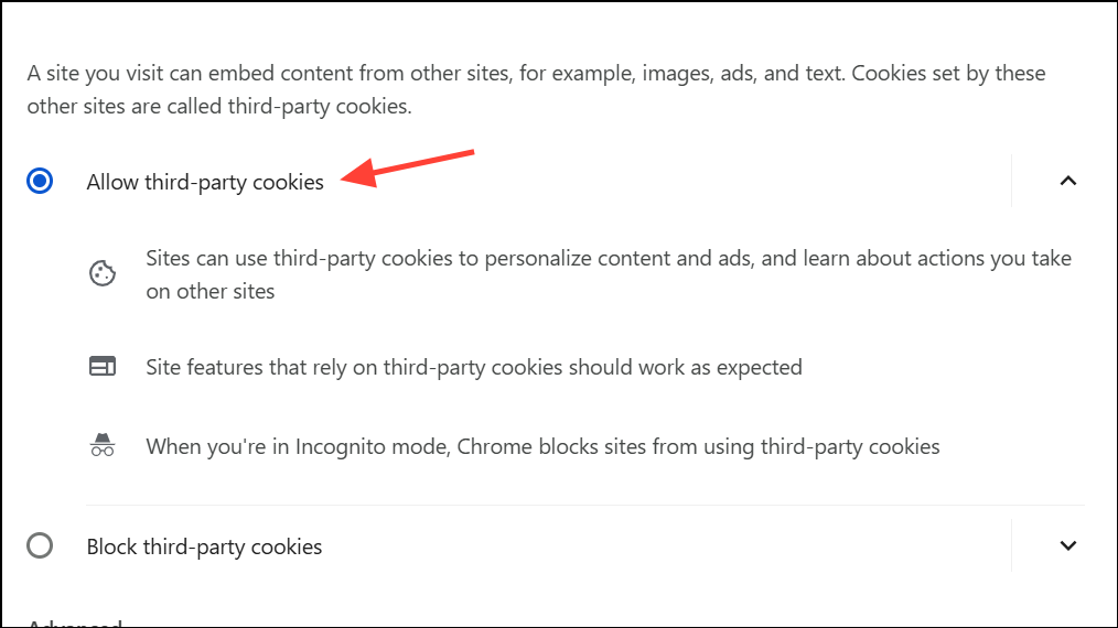 Step 3: Ensure that Allow third-party cookies is selected, or add an exception for drive.google.com and [*.]googleusercontent.com. This adjustment allows Google Drive to communicate with its download servers and trigger the file transfer.