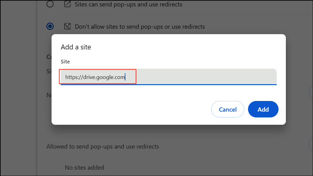 Step 2: Alternatively, manually add an exception. In Chrome, go to Settings > Privacy and security > Site Settings > Pop-ups and redirects, then add https://drive.google.com to the allowed list.