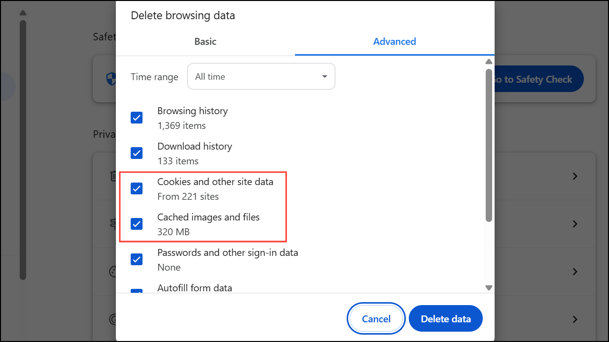 Step 2: Select the options to clear both cookies and cached images/files. Choose a time range of “All time” for a thorough reset.