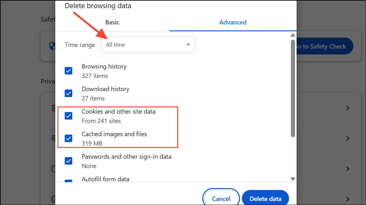 Step 1: In Chrome, click the three dots, select More tools > Clear browsing data, choose All time for the time range, and check Browsing history, Cookies and other site data, and Cached images and files. Click Clear data.