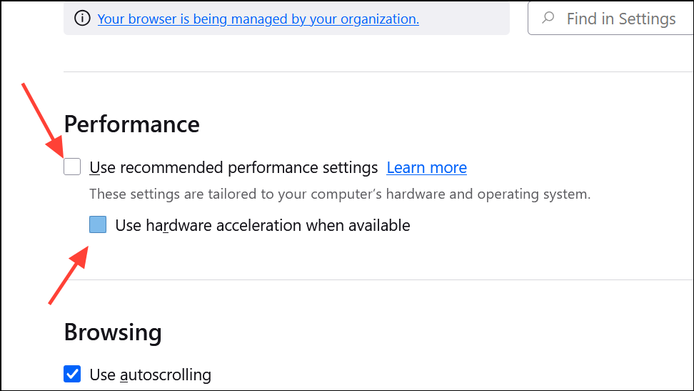 Step 2: In Firefox, go to Preferences > General > Performance and uncheck Use recommended performance settings, then uncheck Use hardware acceleration when available. Restart Firefox.