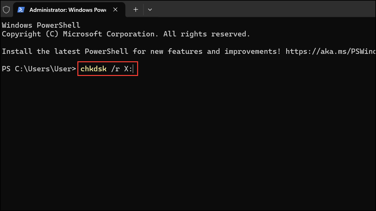 Step 2: Run the command chkdsk /r X:, replacing "X" with the drive letter assigned to your hard drive. This scans and repairs bad sectors.