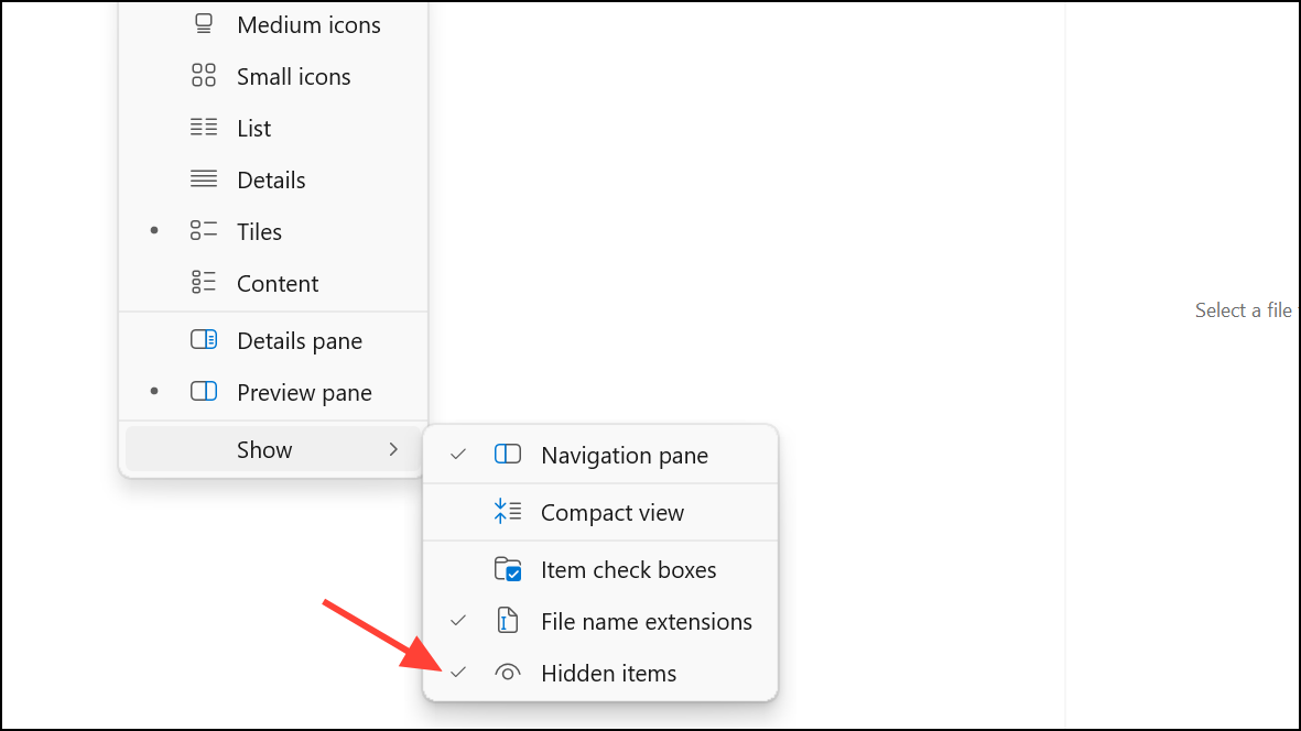 Step 1: Open File Explorer and enable hidden items from the View tab.