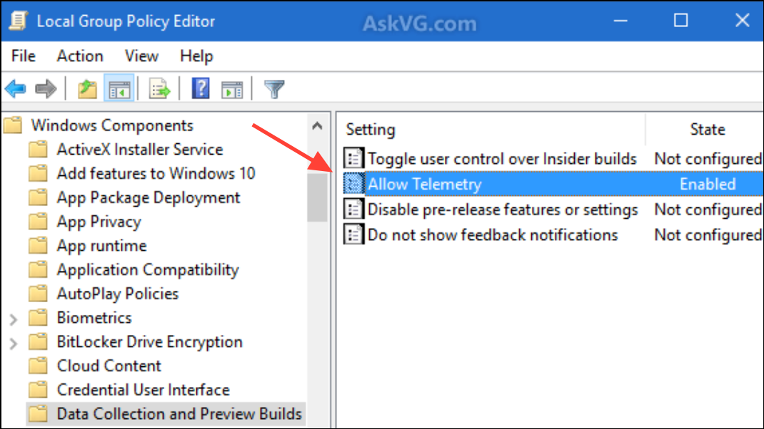 Step 3: Double-click Allow Telemetry, select Disabled, then click Apply and OK. Restart your computer to apply changes.