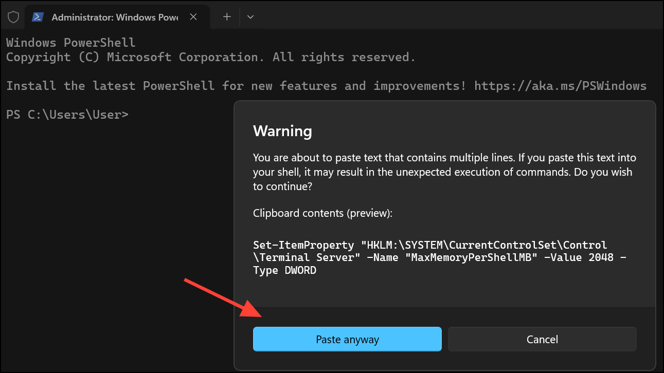 Set-ItemProperty "HKLM:\SYSTEM\CurrentControlSet\Control\Terminal Server" -Name "MaxMemoryPerShellMB" -Value 2048 -Type DWORD