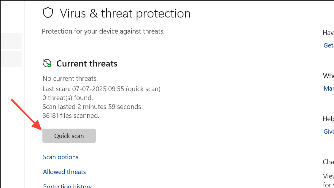 Step 3: Scan for malware using Windows Security. Open Windows Security, navigate to Virus & Threat Protection, and run a Quick Scan. Remove any threats found, as malware can cause unexplained CPU spikes.