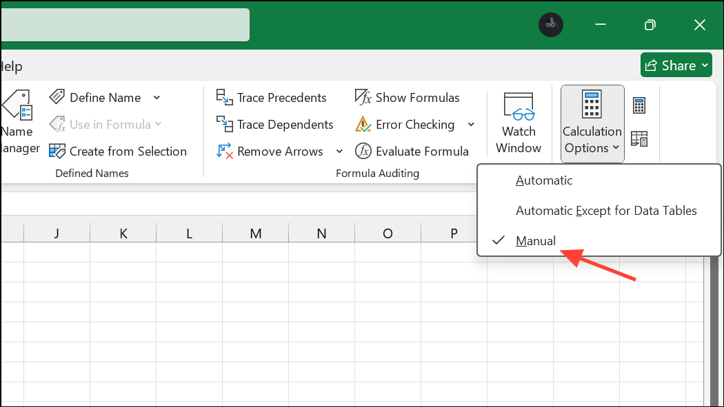 Step 1: Switch Excel’s calculation mode from Automatic to Manual. Go to Formulas > Calculation Options > Manual. This prevents Excel from recalculating the entire workbook every time you make a change. To refresh calculations manually, press F9 when needed.