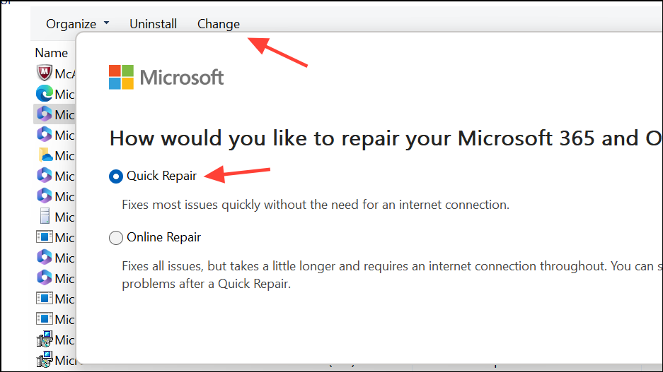 Step 2: If problems persist, repair your Office installation. Open Control Panel > Programs > Programs and Features, select Microsoft Office, and choose Change > Quick Repair or Online Repair.
