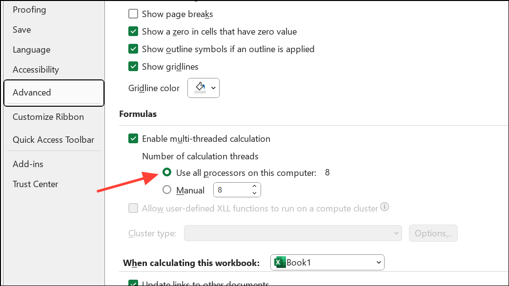 Step 2: Enable multi-threaded calculation in Excel. Navigate to File > Options > Advanced > Formulas and set Enable multi-threaded calculation to use all available processors. This allows Excel to split calculations across CPU cores, speeding up processing for large files.