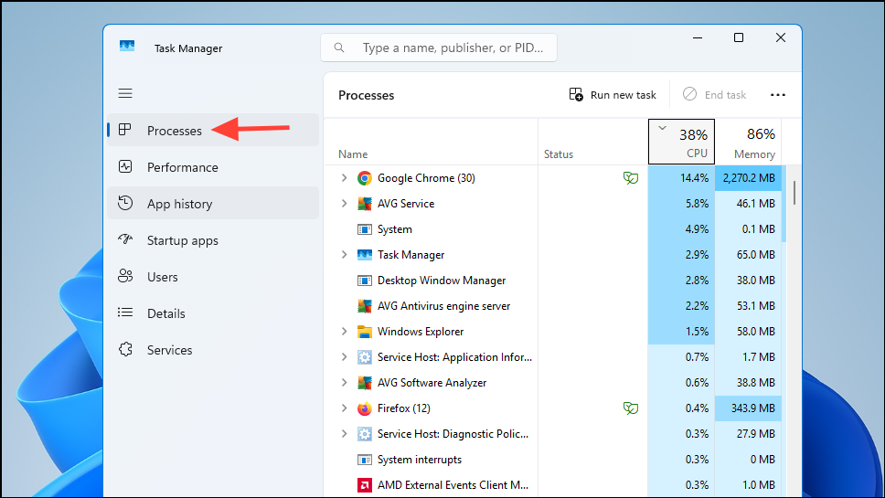Step 1: Open Task Manager by pressing Ctrl + Shift + Esc. Once Task Manager opens, click on the "Processes" tab to view running applications and services.