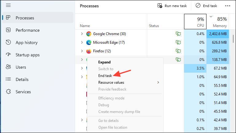 Step 3: Select any unnecessary processes or applications, then click "End Task" to stop them. Be cautious not to end critical system processes. If you're unsure, research the process online before closing it.