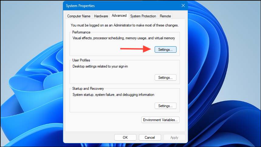 Step 2: In the System Properties window, navigate to the "Advanced" tab and click "Settings" under the Performance section.