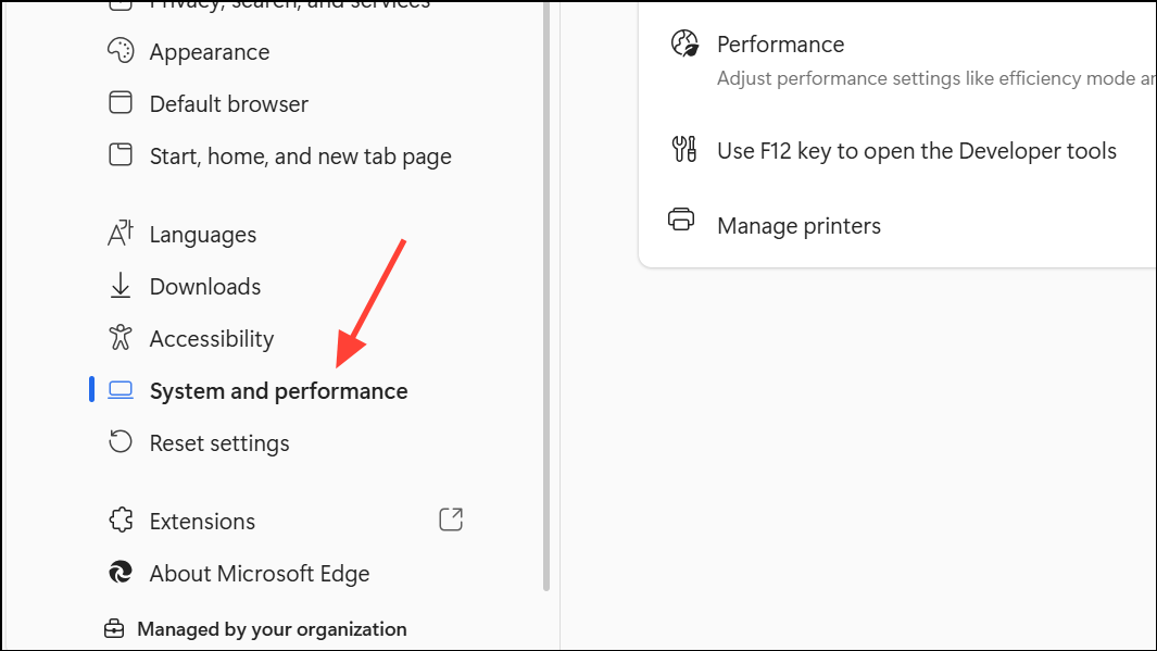 Step 2: In the left sidebar, click System and performance. Scroll to the Manage your performance section.