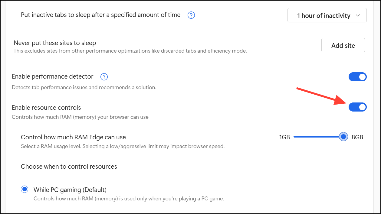 Step 3: Toggle on Resource controls. You’ll see options to apply the RAM limit either When you’re PC gaming or Always. Select your preferred mode.