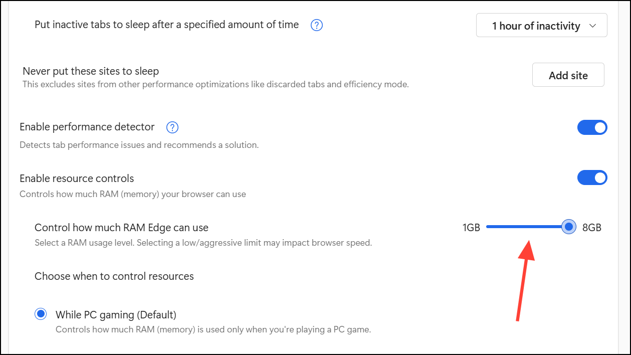 Step 4: Use the slider to set the maximum amount of RAM Edge can use. Be cautious—setting a very low limit may cause increased tab sleeping, page reloads, or slower browsing performance.