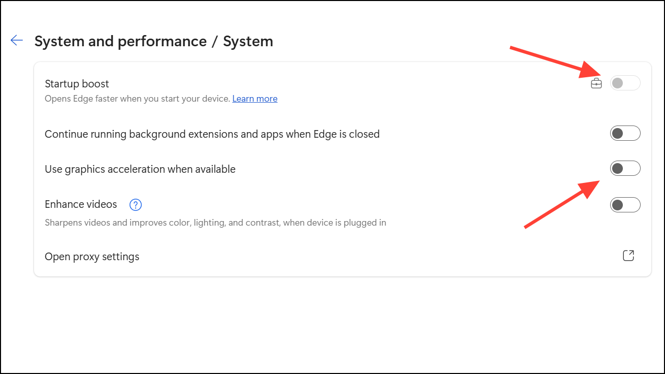 Hardware acceleration shifts some processing tasks to your computer’s GPU, which can sometimes increase memory usage or cause compatibility issues. Startup Boost keeps Edge running in the background for faster launching but can consume RAM even when the browser is closed.